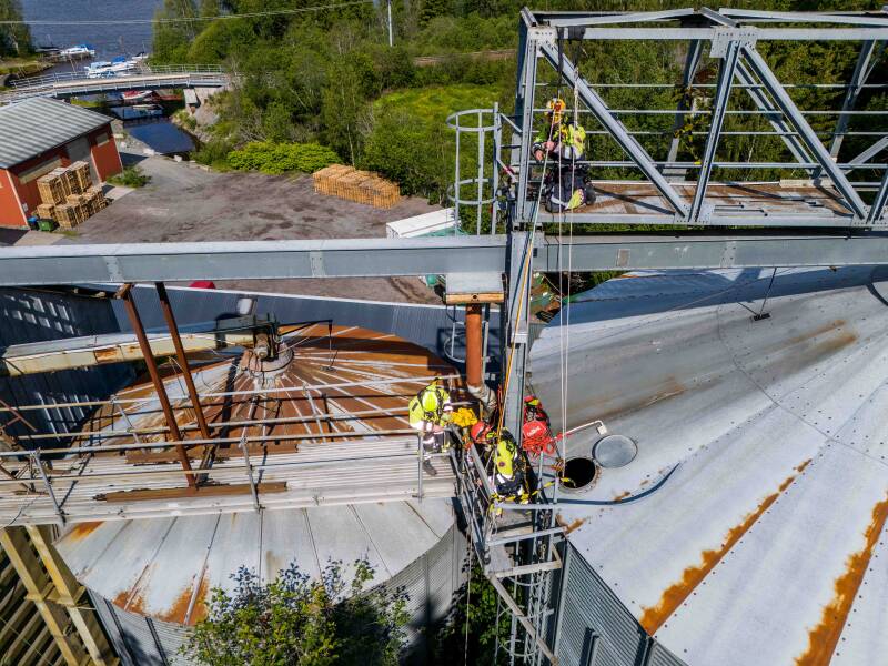 HØYT: Siloen er flere meter høy. Et fall i den høyden kan medføre alvorlige personskader.